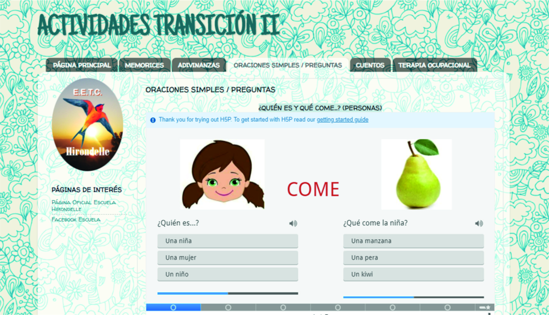 El equipo multidisciplinario, docente y paradocente del nivel transición II, ha trabajado en conjunto en la creación de un blog de actividades interactivas y recreativas para sus educandos. Este consta de una serie recursos, como cuentos, memorices, adivinanzas, ejercicios de completación, etc., para trabajar y reforzar diversas habilidades desde sus hogares.